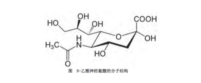 唾液酸是一种9碳多糖的衍生物,也是大脑神经节苷脂和糖蛋白的结构及功能主要组成成分,其中最主要的三种核心形式包括:N-乙酰神经氨酸,N-羟乙酰神经氨酸和2-酮-3-脱氧壬酸。