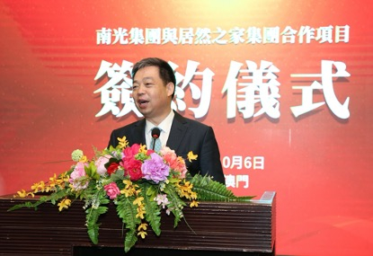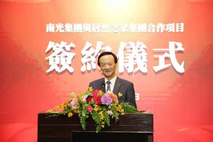 南光(集团)有限公司董事长、澳门中国企业协会会长傅建国在签约仪式现场致辞,展望南光集团与居然之家未来的深度合作。