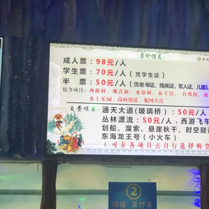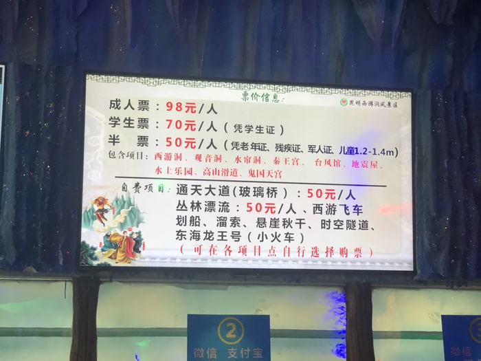 西游洞景区成人票98元,学生票70元,半票是50元,另外还有玻璃桥、丛林漂流等自选项目每个是50元,可购买套票。有网友吐槽,既然景区内的项目是收费的,为何门票还这么贵,自带相机无法在网红打卡点自拍,必须交钱给商家后才可以由商家拍照。尽管如此,西游洞依然是昆明及周边地区人们短途出行的目的地之一。