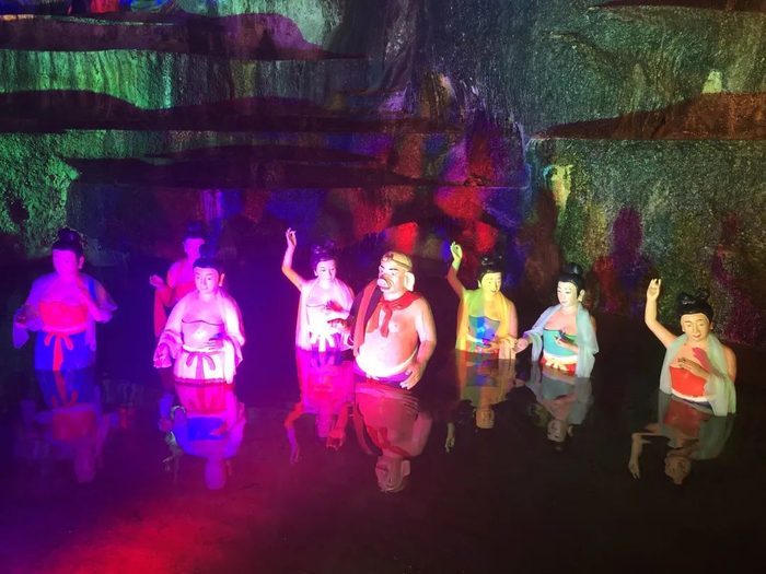 “西游洞”、“水帘洞”、“妖精洞”、“盘丝洞”等景点里有悬吊的钟乳石、矗立的石笋、贯洞而过的河流,大自然的鬼斧神工在洞中展现得淋漓尽致。至于西游的元素,洞中景观和电视剧《西游记》中画面有所相似,其他的便有些“潦草”,诸如西游记中角色的塑像,红绿闪烁的灯光效果和迷雾效果,以及剧组道具。