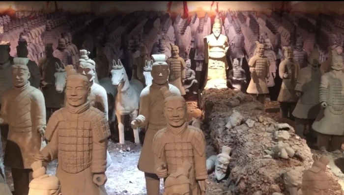 “秦王宫”内陈列了近百个仿制兵马俑。