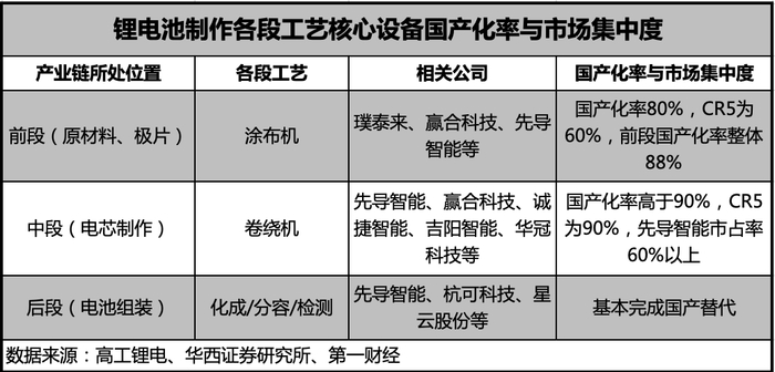 当前,我国锂电池设备国产化率较高。其中,中后端设备门槛较低,国产设备已达国际先进水平;前端设备对整条生产线质量具有重要影响,技术壁垒高,部分核心设备已经达到或接近国际先进水平,且具备明显的价格优势。