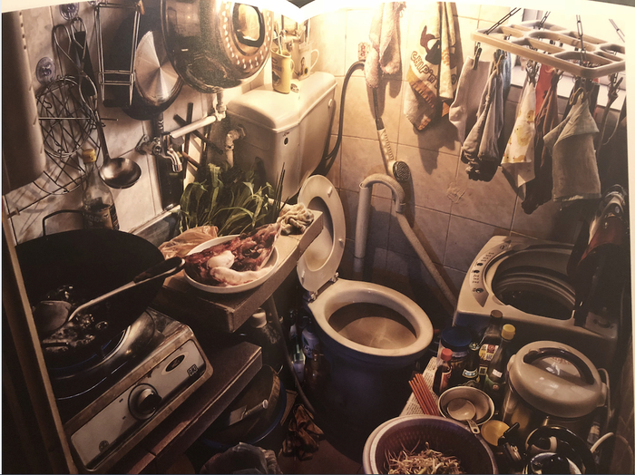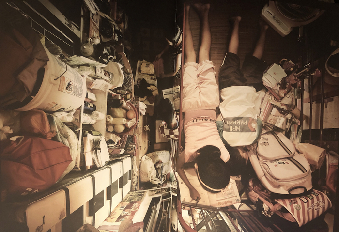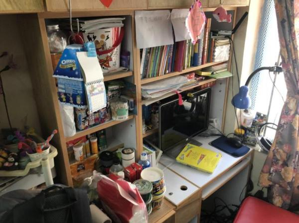 这套600多呎(60平方米)的住宅被业主隔成4间,由于位于顶楼且墙壁漏水,给了住户较低廉的租金——每月3000多港币。这间劏房约有百呎(约10平方米),贴着墙壁摆着两张床,上面堆满生活用品,靠近窗口放着写字台,上方空间敲满两排壁橱。房间深处藏着灶台与马桶,彼此仅有一帘之隔。虽然老旧窗式空调在边上嗡嗡作响,但置身满满物件当中,有种难以言说的燥热感。交流中,还不时传来隔壁劏房哗哗地冲马桶声。