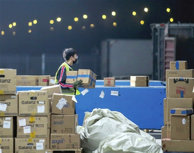 “双11”期间,快递小哥“挑灯夜战”。