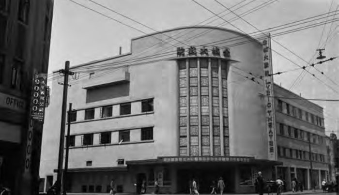 许多电影选择其为首映之地,如《桃李劫》《风云儿女》等。《风云儿女》的主题曲《义勇军进行曲》即后来的中华人民共和国国歌,最先便是从此唱出。1935年8月,国歌的曲作者聂耳的追悼会也在此举行。“北京路冲,贵州路口,新式 之影戏院兀立,即金城大戏院也。按金城戏院,于最近日完工,图样为华盖建筑事务所设计,采用最新式。除入口上部开辟高大之窗数行外,另则设小窗几点而已。其余部分,则施之以极平粉刷,不尚雕饰,为申江别开生面之作。”这两座戏院设计非常新颖,因为华盖建筑事务所三人早有共识——不做大屋顶。“大上海大戏院立面有八根空心玻璃柱子,内装霓虹灯管,从南京路北望是一大片灯光,效果特好。可惜后来金城大戏院、大上海大戏院立面上玻璃柱已全部拆除,面貌全非。”
