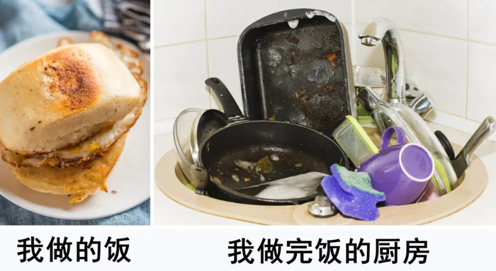 当你自己开始做饭,会发现博主视频中从未出现的很沉的锅、炒糊的肉、布满油渍的灶台、水槽的残渣、难刷的碗等等都在你的厨房集中爆发。
