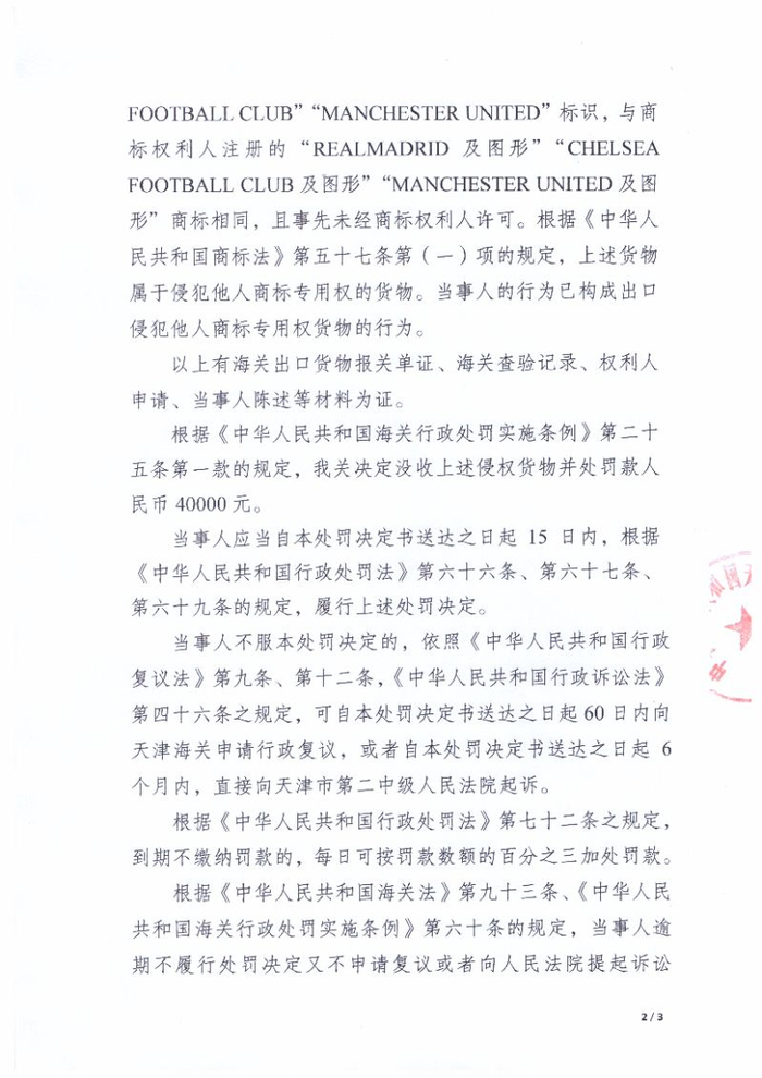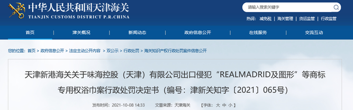 中国质量新闻网讯 近日,天津新港海关发布关于味海控股(天津)有限公司出口侵犯“REALMADRID及图形”等商标专用权浴巾案行政处罚决定书(编号:津新关知字〔2021〕065号)。