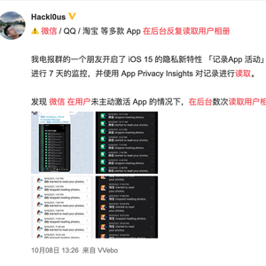10月8日下午1时26分,网友Hackl0us 爆料,新版iOS 15“隐私”中的“记录APP活动”显示,微信在用户未主动激活应用的情况下,在后台数次读取相册,每次读取时间长达40秒至1分钟不等。Hackl0us 认为读取用户隐私信息必须要让用户知情是底线,腾讯微信官方需要回答为什么要这么操作,究竟读取了什么额外信息等情况。
