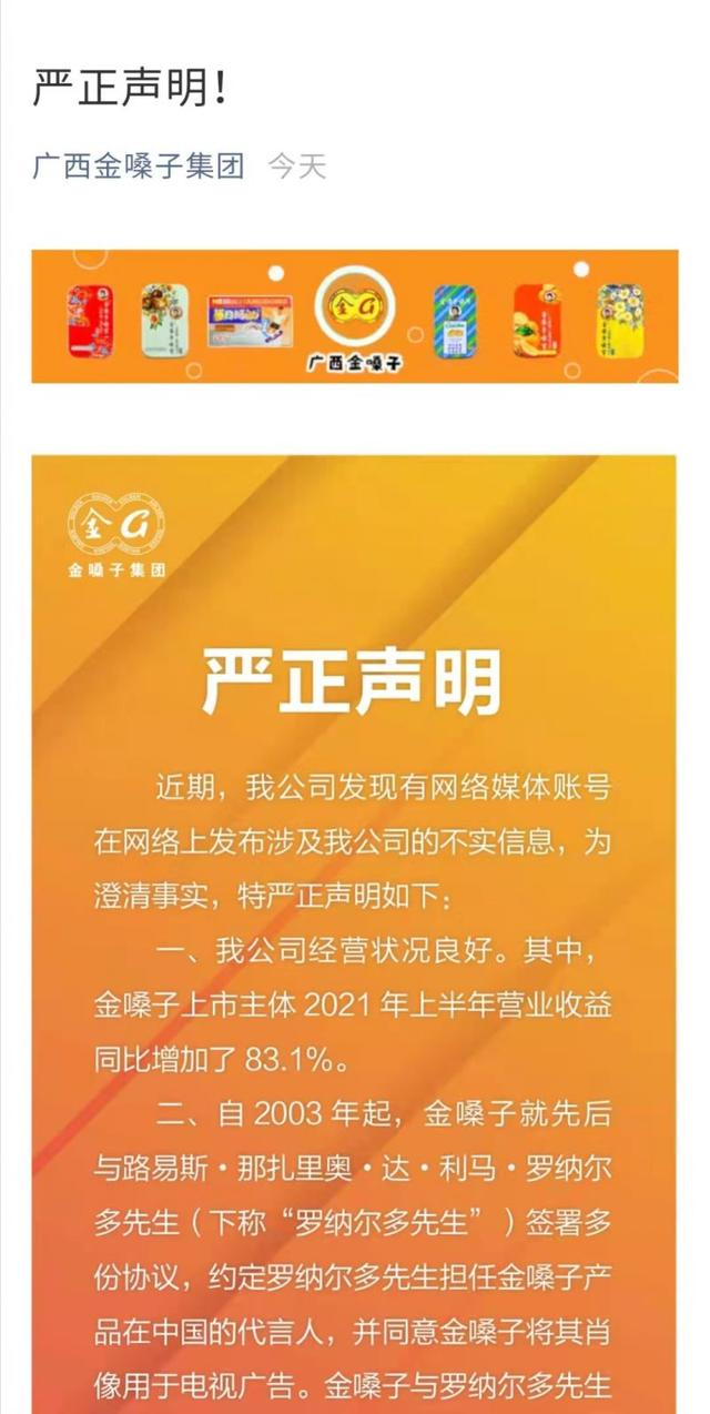 自2003年起,金嗓子就先后与路易斯·那扎里奥·达·利马·罗纳尔多先生(以下简称“罗纳尔多”)签署多份协议,约定罗纳尔多担任金嗓子产品在中国的代言人,并同意金嗓子将其肖像用于电视广告。金嗓子与罗纳尔多的广告合作有双方签署的协议作为合法基础。金嗓子和江佩珍不存在网络传言所载“忽悠罗纳尔多”、“用饭局上的素材制作了‘罗纳尔多代言金嗓子喉片’的广告”等情形。