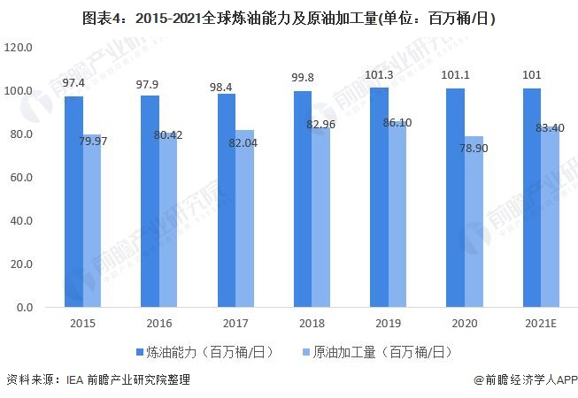 石油化工产品是在炼制的基础上,以炼油过程提供的原料进一步化学加工获得化工产品。根据世界能源署(IEA)数据显示,2015-2019年全球原油加工能力和原油加工总量呈上升趋势。2020年受全球疫情影响,2020年全球原油加工量78.90百万桶/日,同比下降8.36%。2021年随着疫情的逐渐好转,全球炼油厂原油加工量预计将反弹,IEA预计,2021年全球原油加工量将达到83.40百万桶/天。