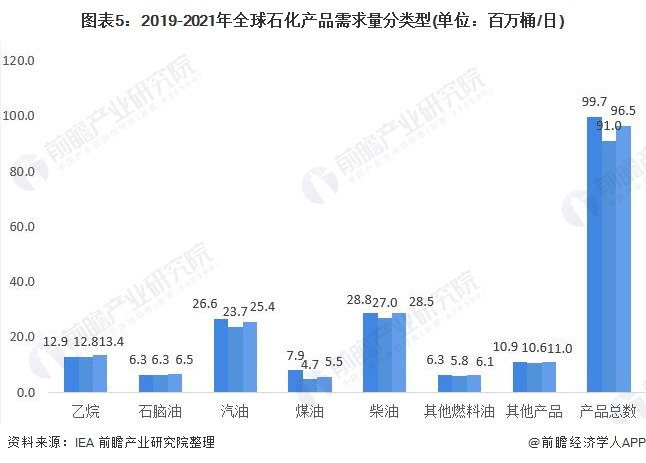 根据世界能源署(IEA)统计数据显示,2019-2021年全球石化产品需求量整体波动较为明显,2020年,疫情的全球蔓延对全球石化产业造成了巨大的影响,各类石化产品需求量均出现不同程度的减少。需求总量从2019年的99.7百万桶/日下降到2020年的91.0百万桶/日,下降幅度达到8.73%。2021年随着世界疫情的逐步稳定,根据世界能源署的预测数据,2021年全球石化产品需求总量将上升至96.5百万桶/日。