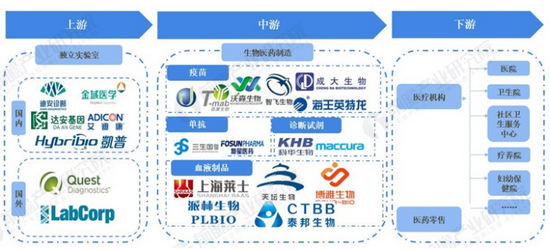 在上游医药研发行业,国外独立实验室Quest以及Labcorp是全球知名企业,国内以迪安诊断、金域医学、凯普生物等企业为主。从中游生物医药制造来看,疫苗领域以智飞生物、沃森生物等企业为主,单抗领域以复星医药、三生国健等企业为主,诊断试剂领域以科华生物、迈克生物等企业为主,血液制品领域以上海莱士、天坛生物等企业为主。下游消费终端以医疗机构和零售药店为主。