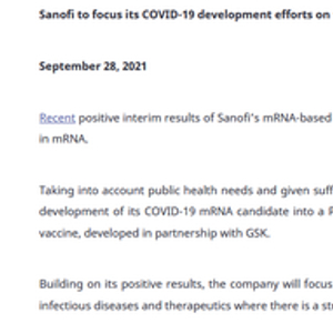 9月28日,法国制药巨头赛诺菲官方消息称,考虑到公共卫生需求以及未来有足够的mRNA COVID-19疫苗供应,赛诺菲决定不将其COVID-19 mRNA候选药物开发为Ⅲ期临床研究,并将把mRNA资源集中在新成立的mRNA卓越中心,重点应用在流感、其它传染病和肿瘤等疾病上。