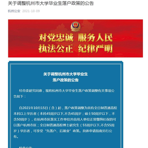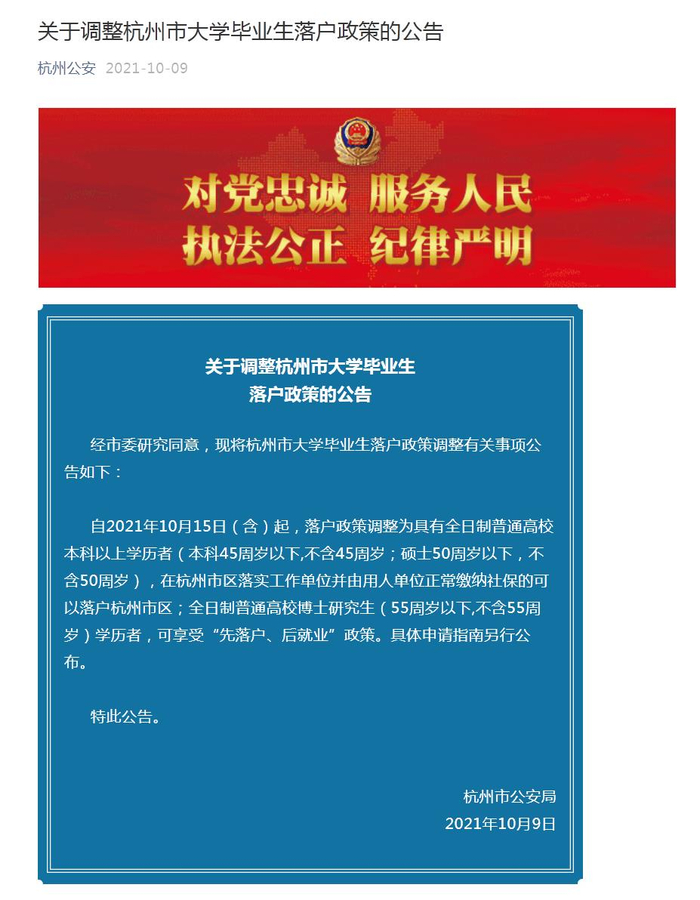 中新经纬10月9日电 据“杭州公安”微信号9日消息,杭州市公安局发布关于调整杭州市大学毕业生落户政策的公告。