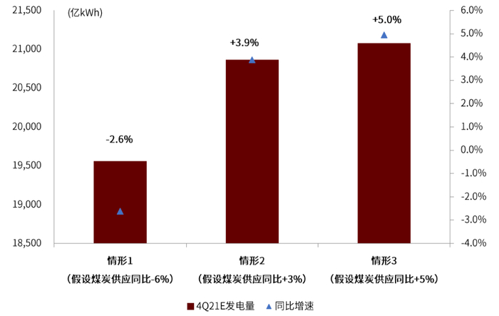 我们认为四季度电力供应量主要取决于煤炭供给量。基于大宗组煤炭供给量判断的三种情形,我们预测四季度火电发电量增速-5.9%/+3.3%/+4.8%,同时结合水电、核电、风电、光伏的电量预测(基于8月底装机及利用小时预测),得到三种情形下四季度总发电量增速-2.6%/+3.9%/+5.0%(vs 4Q20发电量同比增速7.1%)。