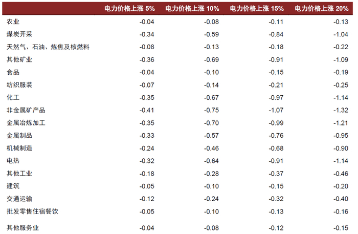 图表:电力价格上涨对不同行业价格的影响(%)