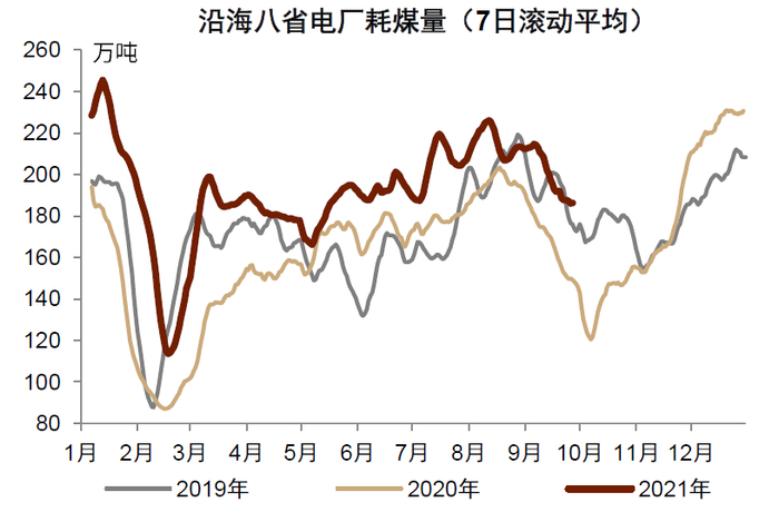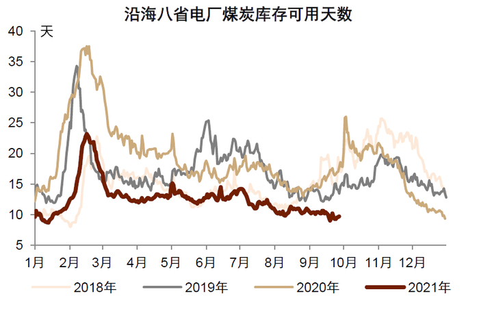 煤炭短缺加大了电力供给压力,近期发电耗煤和库存可用天数均持续回落。沿海八省电厂的高频数据显示[1],8月以来发电耗煤量季节性回落的同时,较往年同期的增幅也是在持续收窄。比如7月日均耗煤量较2019年同期增长21.2%,8月的增幅收窄至5.4%,9月中下旬以来进一步收窄至0.4%(截至9月27日)。同时,电厂库存趋于紧张,9月以来库存可用天数不仅没有出现季节性反弹,反而持续回落,9月中下旬电厂存煤可用天数降至10天以下。