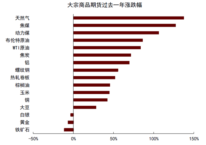 图表:大宗商品期货过去一年涨跌幅(截至2021年9月24日)