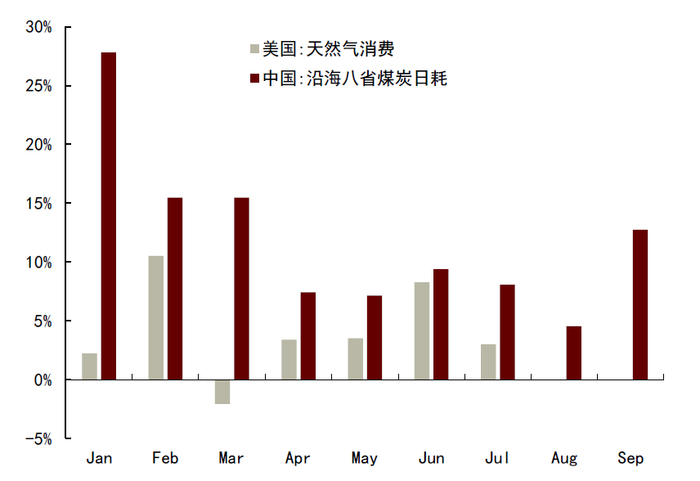 图表:中国动力煤与美国天然气消费增速(同比于过去五年均值)