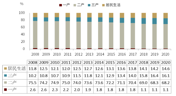 疫情后,电力消费弹性进一步大幅上升,主要是因为1)外需强劲,而出口占比较高的行业自身消耗电力多,且所需原材料较多,而原材料生产行业同样高耗能,使得二产用电需求弹性上升;2)接触类服务消费仍受疫情扰动,但是其用电有刚性,使得住宿餐饮、批零、租赁商务服务等行业单位产出对应的电力消耗系数抬升(比如,饭店不管客人多少,灯都得开着),而疫后信息化加速和5G加快普及,通信软件业电力消耗系数上升,带动三产用电需求弹性上升;3)农村电网改造继续、生猪养殖加快,一产用电需求弹性上升;4)疫后居家增多,居民生活的用电占比上升较快。从各领域用电量占比看,第一产业占比1.1%,第二产业占比最高在68%左右,第三产业和居民生活用电占比在持续提升,2020年已经升至近31.0%。从具体细分行业看,用电量占比较高的行业还是集中在四大高耗能行业(黑色、化工、有色及非金属矿物制品业)。