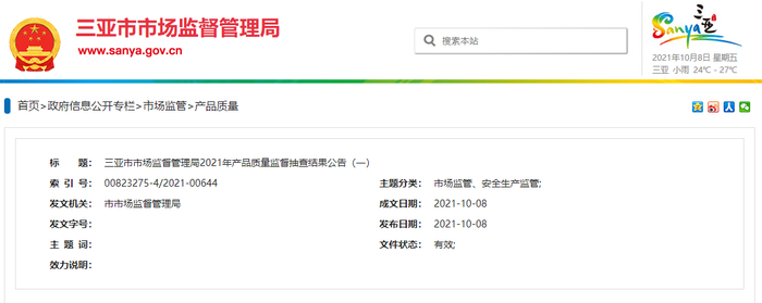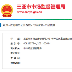 中国质量新闻网讯 10月8日,海南省三亚市市场监督管理局网站公布2021年产品质量监督抽查结果(一)。2021年该局对食品相关产品进行了产品质量监督抽查,共抽样12家企业的40批次产品(11家销售企业的39批次产品、1家生产企业的1批次产品),检验结果均合格。