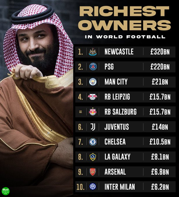 根据英国每日邮报的统计数据显示,背靠沙特主权财富基金的纽卡斯尔联队,目前已无可争议地成为了全球最富有的足球俱乐部。除了紧随其后的法甲豪门巴黎圣日耳曼,其他俱乐部金主们的财富规模都至少要比其少上一个“0”!