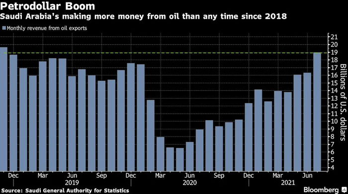 在疫情期间大幅削减原油产量18个月后,由于全球经济复苏迫切需要能源供应,沙特本月的原油产量将接近疫情前的980万桶/天水平。目前,全球原油价格已经一路飙升至了每桶80美元,这使得沙特的石油收入有望达到三年来的最高水平,从而在2022年获得更多的财政支出。