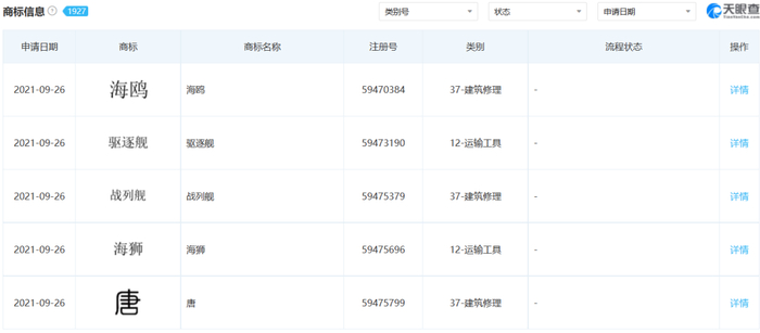 10月9日,中证君从天眼查获悉,比亚迪日前申请注册了军舰系列商标,包括“巡洋舰”“护卫舰”“登陆舰”“驱逐舰”“战列舰”等商标,国际分类涉及运输工具、建筑修理,目前商标状态均为申请中。