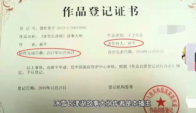 除了商标,郝平还展示了他获得的“《冰雪长津湖》故事大纲”作品登记证书,著作权人是他本人,作品完成时间是2018年11月5日。视频的最后,郝平预祝电影《长津湖》票房长虹,而“剩余的事情交给电影发行方”。