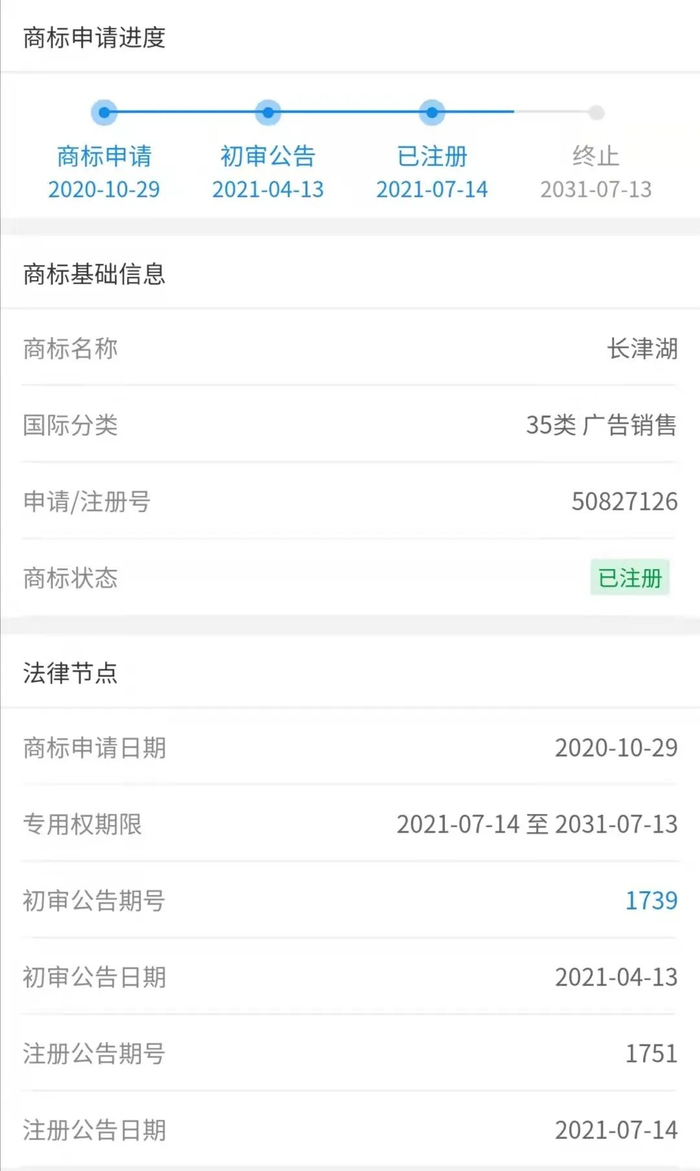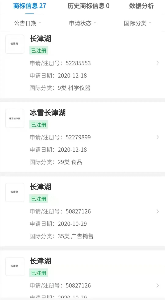 记者通过企查查APP查询得知,郝平口中的“朋友公司”名为北京加点水文化传媒有限公司,其确实提交了多件“长津湖”“冰雪长津湖”的商标注册申请,国际分类包括第35类、41类等,其中在国际分类为35类下的“长津湖”商标,提交商标注册申请的时间是2020年10月,而电影《长津湖》的立项时间为2019年。