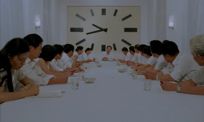单位集体开会商议赵书信的去留问题一场戏,会场环境与众人着装都是白色,但墙上见证损耗不断加重的巨大时钟的指针,却是黑色。黑与白的强烈对比,宛若赵书信与社会机制的关系,他渴望能做些什么但并不被允许,只能干坐在一边自我消耗。