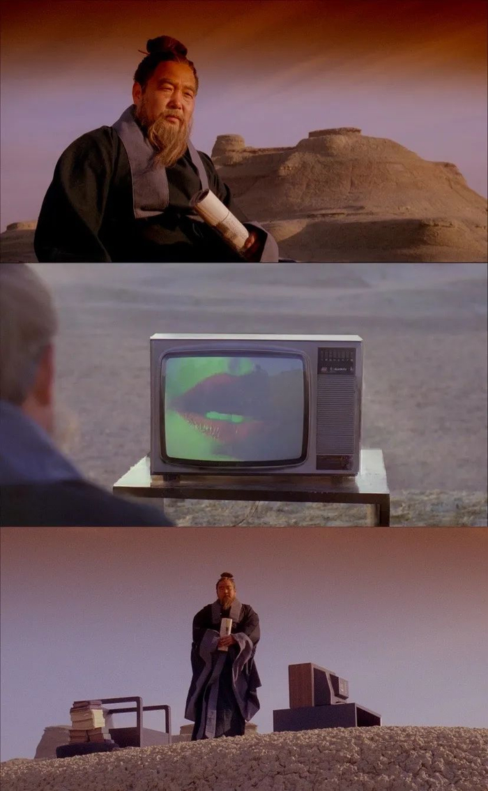 赵书信梦见自己来到一处荒漠,看到古代的思想大家老子正在看着电视。老子身体两侧放着书架与图书,手里也拿着一本线装书籍,但他的注意力,全在电视里的美人与美景上面。稍后,他关掉电视,对着观众说出《道德经》里的名句,“祸兮,福之所倚,福兮,祸之所伏。孰知其极?其无正也。正复为奇,善复为妖。人之迷,其日固久。”