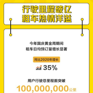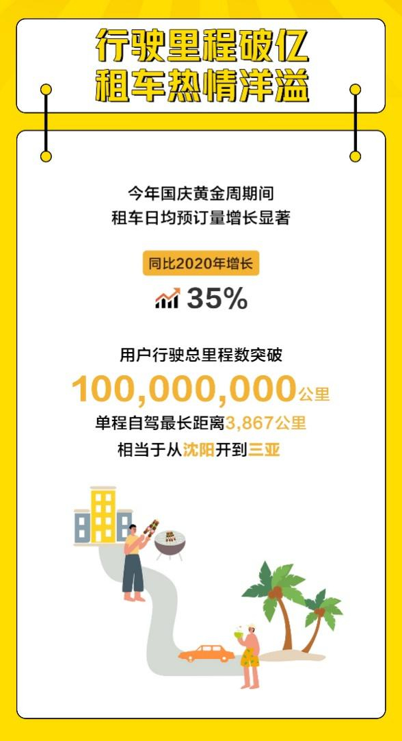 据神州租车数据,今年国庆黄金周期间,租车订单总量增长显著,日均预订量较2020年同期提升近35%,且从出行半径上来看,用户行驶总里程数突破1亿公里,最长行驶里程更是达到了3867公里,相当于从沈阳开到三亚。