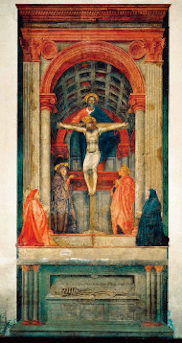 (公元1427年) 马萨乔 圣三位一体 壁画 〔意〕佛罗伦萨圣玛利亚·诺韦拉教堂藏