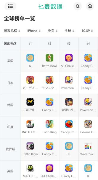 根据七麦数据检测,在10月9日全球免费游戏总榜中,Candy Challenge 3D、All Challenges-survival game、K-Games Challenge等与《鱿鱼游戏》有关的游戏产品,在美国、日本、韩国、俄罗斯、英国等多个国家或地区的游戏榜单中位列前五。