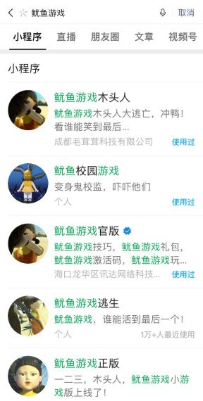 通过微信搜索发现,在微信小程序中已有近百款名称中含有“鱿鱼游戏”的小游戏,其中部分小游戏已有上万人使用。