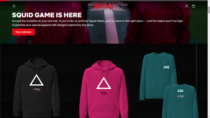 在奈飞旗下电商平台Netflix Shop中,醒目的“SQUID GAME IS HERE”(鱿鱼游戏在这里)已然出现在网站首页,而其售卖的周边产品主要为几款带有《鱿鱼游戏》元素的T恤衫,售价在34.95美元至49.95美元之间。与第三方平台相比,奈飞自身售卖的周边产品无论是种类还是款式都不比第三平台丰富,而那些在淘宝等电商平台售卖的“同款周边”显然也并未获得奈飞的正版授权。