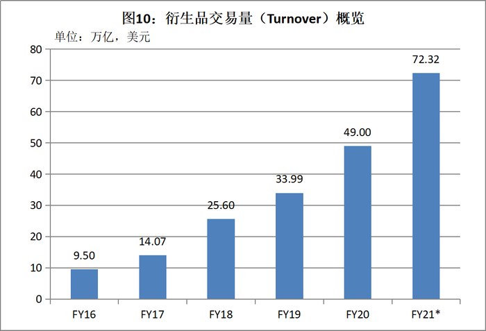 另一个值得留意的趋势是产品细分市场日益成熟。反应在衍生品市场上,衍生品换手量在 2020 财年达到 3453.9 万亿卢比(49.4 万亿美元),在2021 财年的前11个月(2020年4月至2021 年 2 月)达到 5316.4 万亿卢比(72.3万亿美元)。2021 年 1 月,NSE推出Nifty Financial Service Index 的衍生产品,预计将为机构和零售投资者提供更多的投资灵活性。