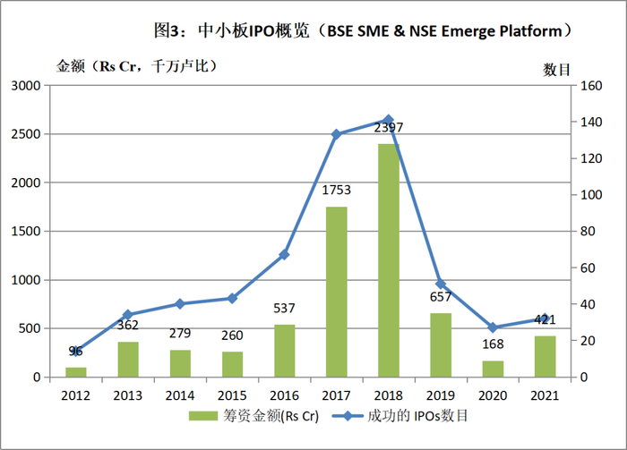 衡量资本市场发展程度的另一个重要指标是当地交易所的筹资能力。截止9月份,今年印度两大交易所(BSE,孟买证券交易所;NSE,印度国家证券交易所)IPO达72宗(其中主板40宗),已经筹集资金88.3亿美元(其中主板约87.7亿美元),超过过去三年的总和,按照目前的速度估算,2021年全年预计将达到创纪录的118亿美元。