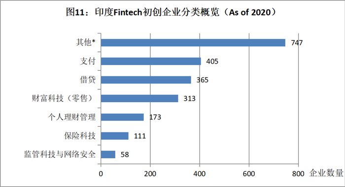 与NBFC快速发展同步,并成为其重要推手的,是印度金融科技产业的繁荣。作为全球增长最快的金融科技市场之一,印度现有2100多家金融科技公司(截止2020年底,Statista数据),其生态系统覆盖支付、贷款、财富技术(WealthTech)、个人理财管理、保险技术(InsurTech)、监管技术(RegTech)等细分市场,刚好与NBFCs的业务范畴高度重合。