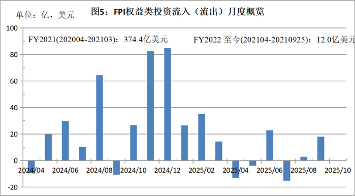 在 2021 财年,印度见证了强劲的 FPI 权益类投资流入,金额达27403 亿卢比(约374.4亿美元),创下了有史以来年度最高记录,同时也占到过去30年来FPI权益类投资流入的26%。而2021年2月到4月的股市调整,对应在FPI上可以看出明显的投资流出趋势,一定程度上也印证了外资进出与股市起落之间的相互作用。受到月间变动的影响,2022财年至今(2021年4月至9月25日)FPI净流入为891亿卢比(约12.0亿美元),远低于去年同期水平。