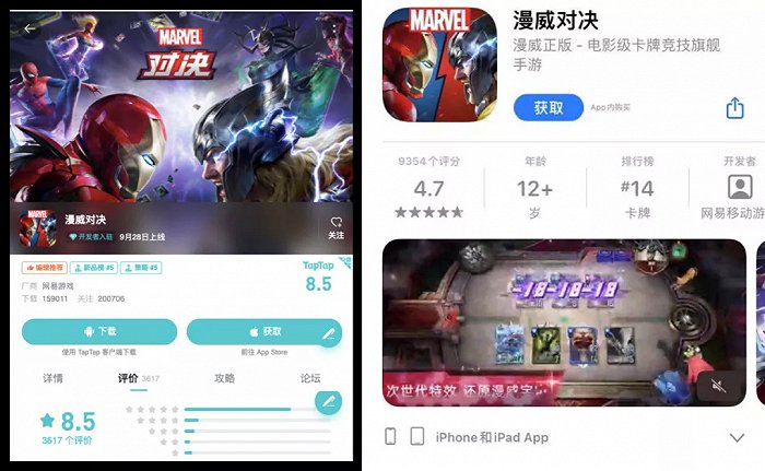 我们既可以说这是在搞“融合怪”,但从另一个角度来说网易也总算试图在游戏模式和游戏性方面下点功夫,总归不是一款看起来就没诚意的IP换皮手游了。TapTap8.5分,App Store 4.7分,这甚至已经算是比较高的卡牌游戏分数了。但说来奇怪,口碑虽然更好,但《漫威对决》热度排名下滑的速度却丝毫不比《漫威超级战争》慢,这就有些耐人寻味了。