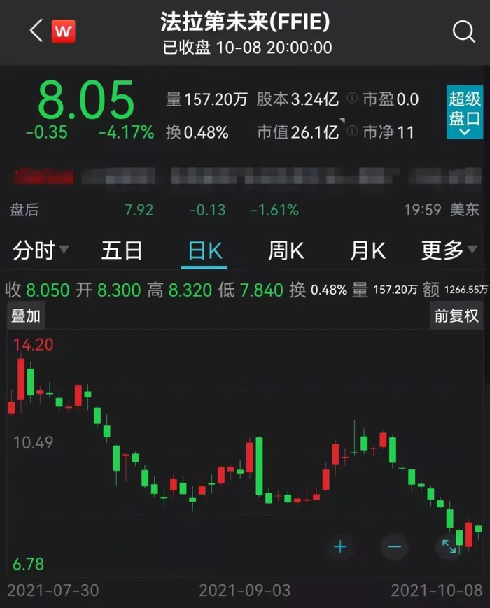 美国当地时间7月22日,FF公司正式在纳斯达克上市,上市首日盘中股价即出现破发。截至 10月8日收盘,FF股价下跌4.17%,报8.05美元,相较发行价13.78美元,已经跌去41.58%;相较于上市首日最高点的17美元,已跌去近60%。