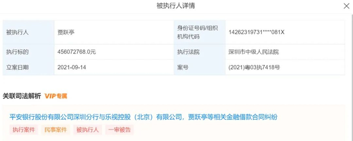 至于贾跃亭本人,自乐视危机之后一直深陷债务泥潭。天眼查显示,9月14日,贾跃亭新增一条被执行人信息,执行标的4.56亿元,关联案件为平安银行与乐视及贾跃亭的金融借款合同纠纷。目前,贾跃亭关联10条被执行人信息,被执行总金额超过90亿元。