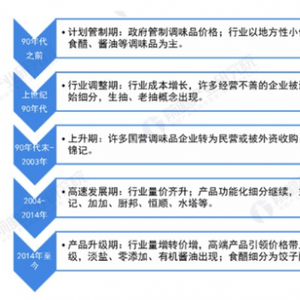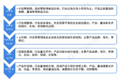 我国调味品行业历经计划管制期(90年代之前)、行业调整期(90年代)、行业上升期(90年代末-2003年)、高速发展期(2004-2014年),于2014年后开始进入产品升级期,功能化和健康化的产品细分创造新的需求量,品类细分成为必然趋势。