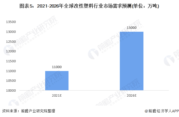 2018年以来全球经济不稳定因素加强,全球贸易摩擦加剧,同时多个国家颁布“限塑”、“禁塑”政策,令塑料行业发展前景蒙上一层阴霾,改性塑料行业因此也受到影响。2021年新冠疫情在全球范围影响较大,全球生产和贸易活动受影响,改性塑料行业需求下降,目前来看,全球整体上新冠疫情仍然较为严峻,行业发展前景不容乐观,前瞻预计,2021年全球改性塑料行业需求量变化较大,约为11000万吨左右,新冠疫情结束后,随着生产和消费的恢复,改性塑料市场需求将有较大幅度提升,未来全球改性塑料行业市场需求增速将在3%左右,前瞻预计,到2026年全球改性塑料行业市场需求量将达到13000万吨。