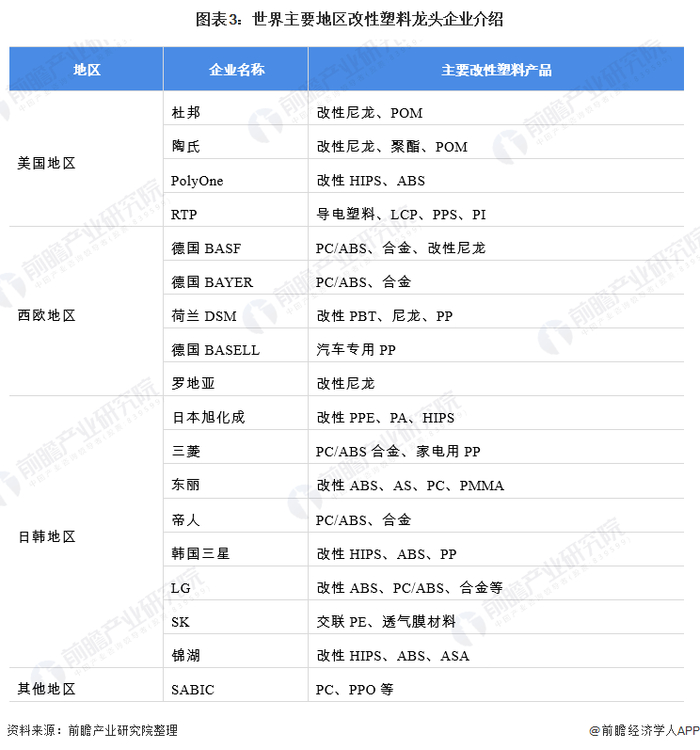 从企业总体竞争格局来看,全球知名的改性塑料生产企业主要有杜邦、陶氏、巴斯夫、罗地亚、三菱、帝人等企业。