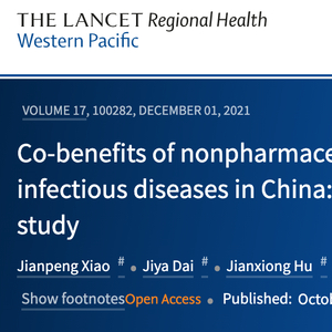 当地时间10月1日,国际顶级医学期刊《柳叶刀》(The Lancet)旗下期刊《柳叶刀-区域健康》(西太平洋)(The Lancet Regional Health - Western Pacific)在线发表了该项研究成果:《中国新冠疫情防控非药物干预措施的伴随效益:一项大型人群观察研究》(Co-benefits of nonpharmaceutical intervention against COVID-19 on infectious diseases in China: A large population-based observational study)。
