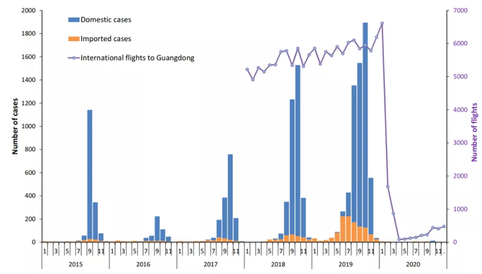广东省2015-2020年按月登革热报告病例数及入境广东省航班流量。 广东省公共卫生研究院 图