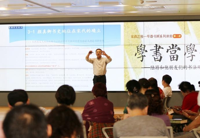 这是由杭州市社会科学院和杭州图书馆联合主办的《宋韵之雅——“琴器书画”系列讲座》第二讲,特邀杭州师范大学美术学院教授、中国书法家协会理事、学术委员会副主任方爱龙讲述《“学书当学颜”——陆游和他朋友们的书法观》。聆听着方教授专业详细的讲解、欣赏着台上一幅幅精妙的南宋“颜字”PPT,许多观众如痴如醉。